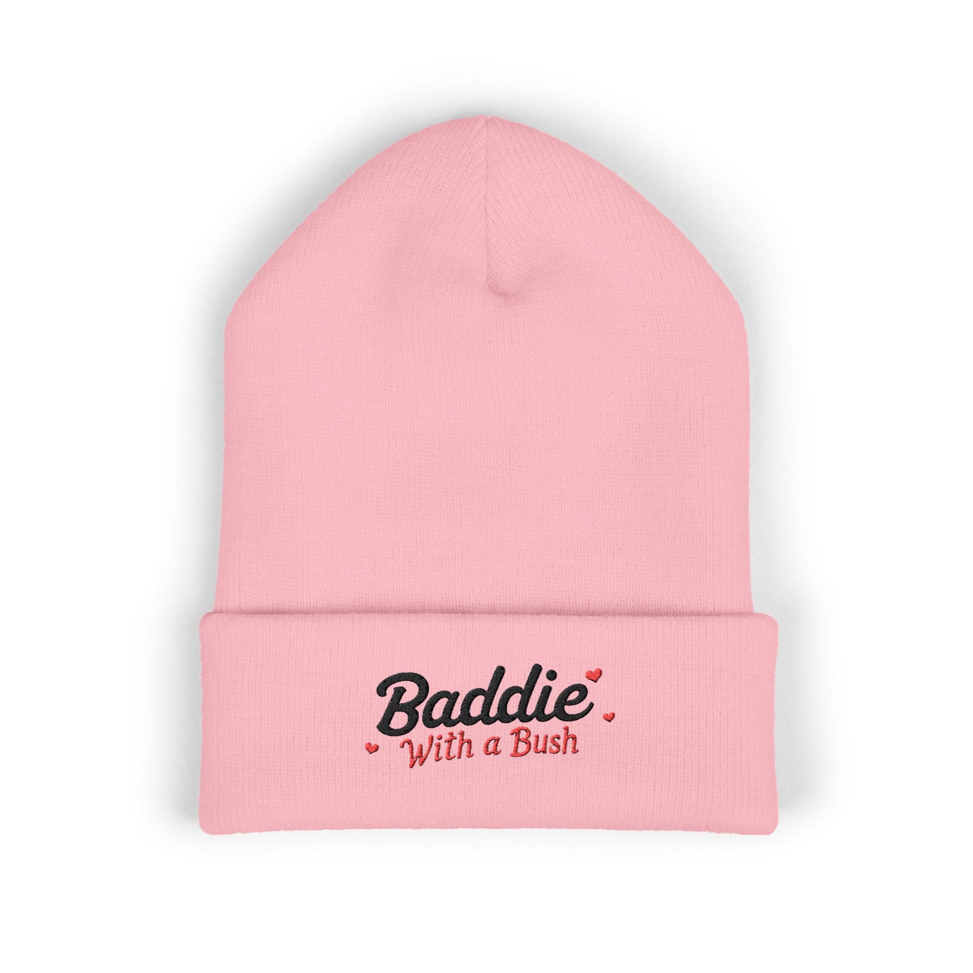 “Baddie With a Bush” Embroidered Pink Beanie – Soft, Hypoallergenic Knit Hat for Bold Style