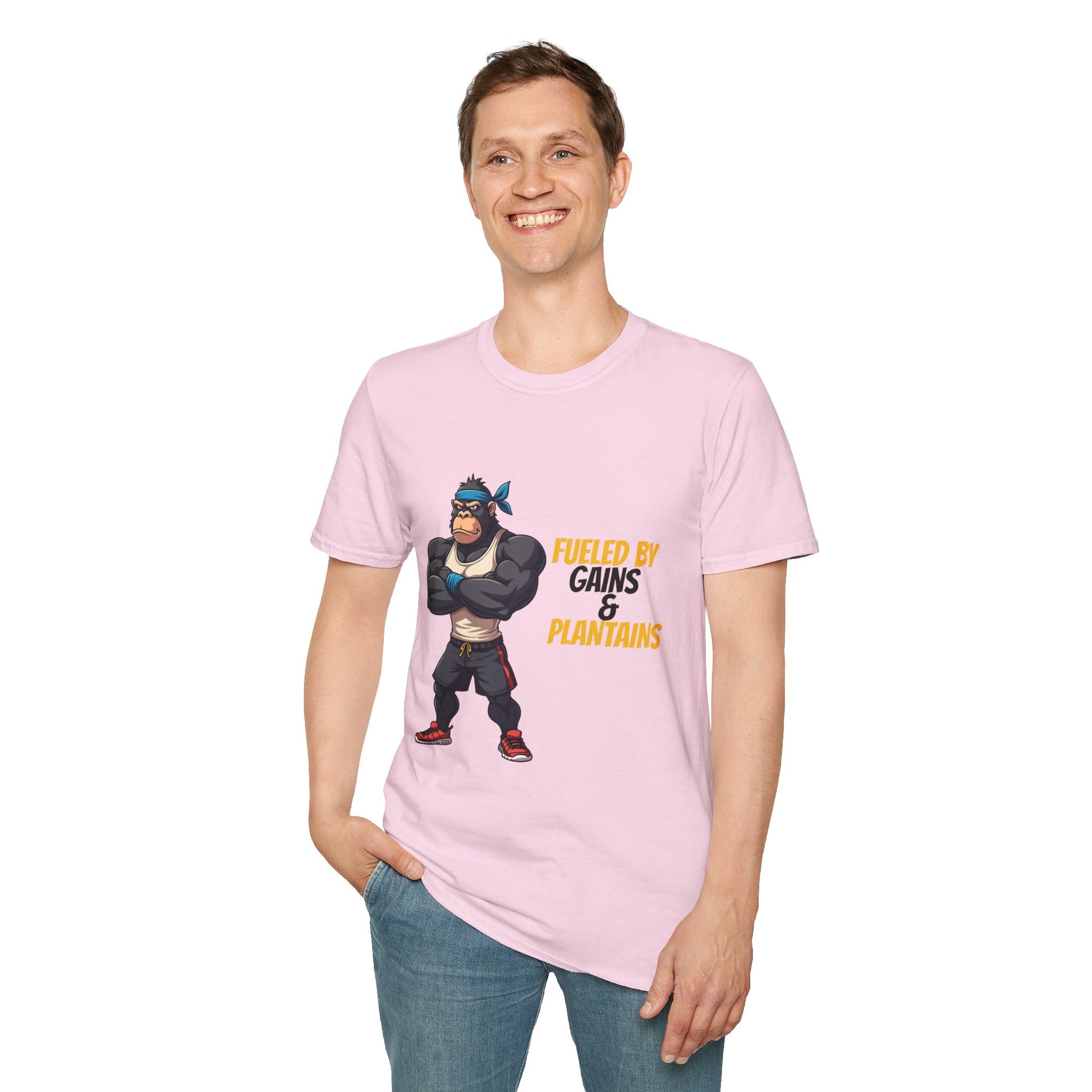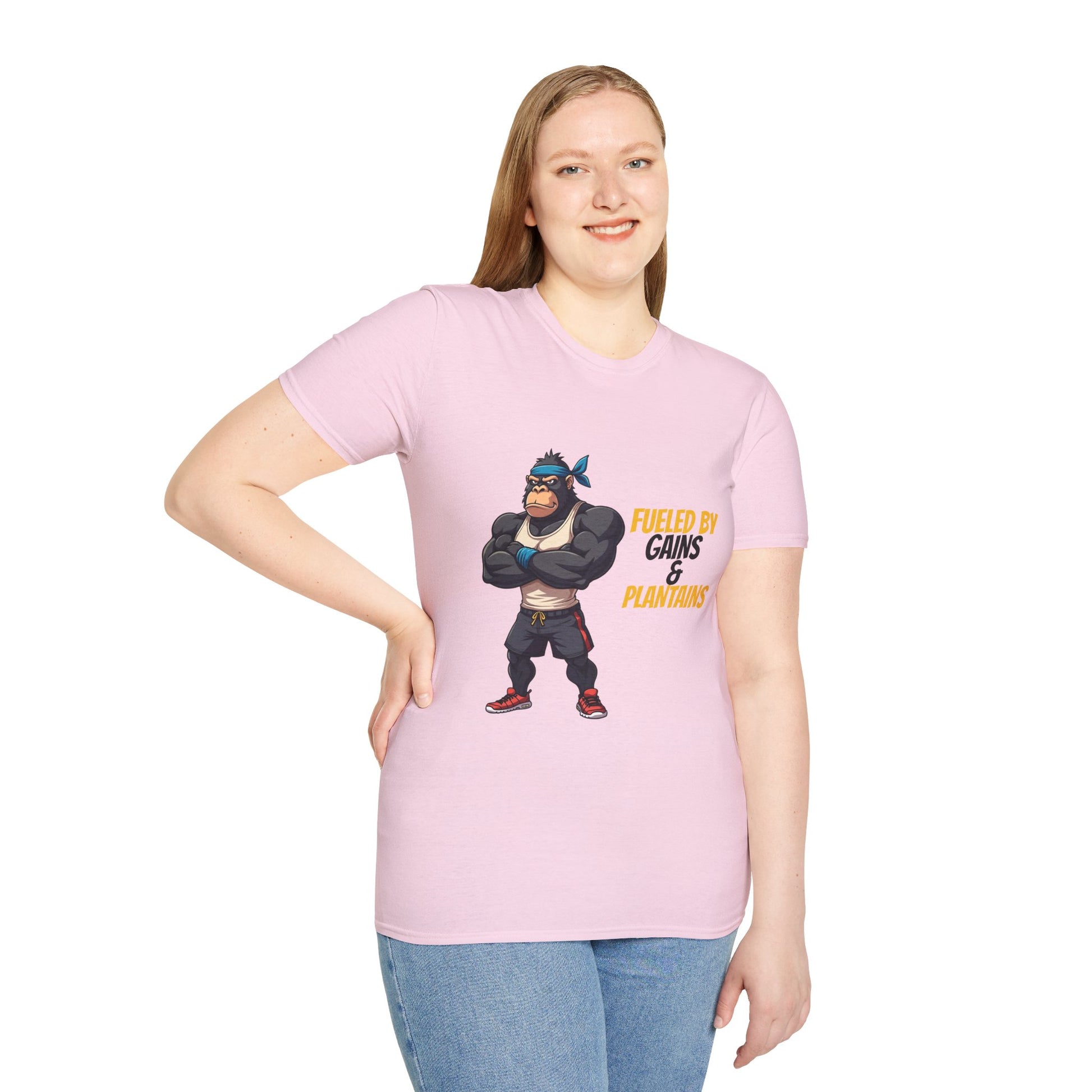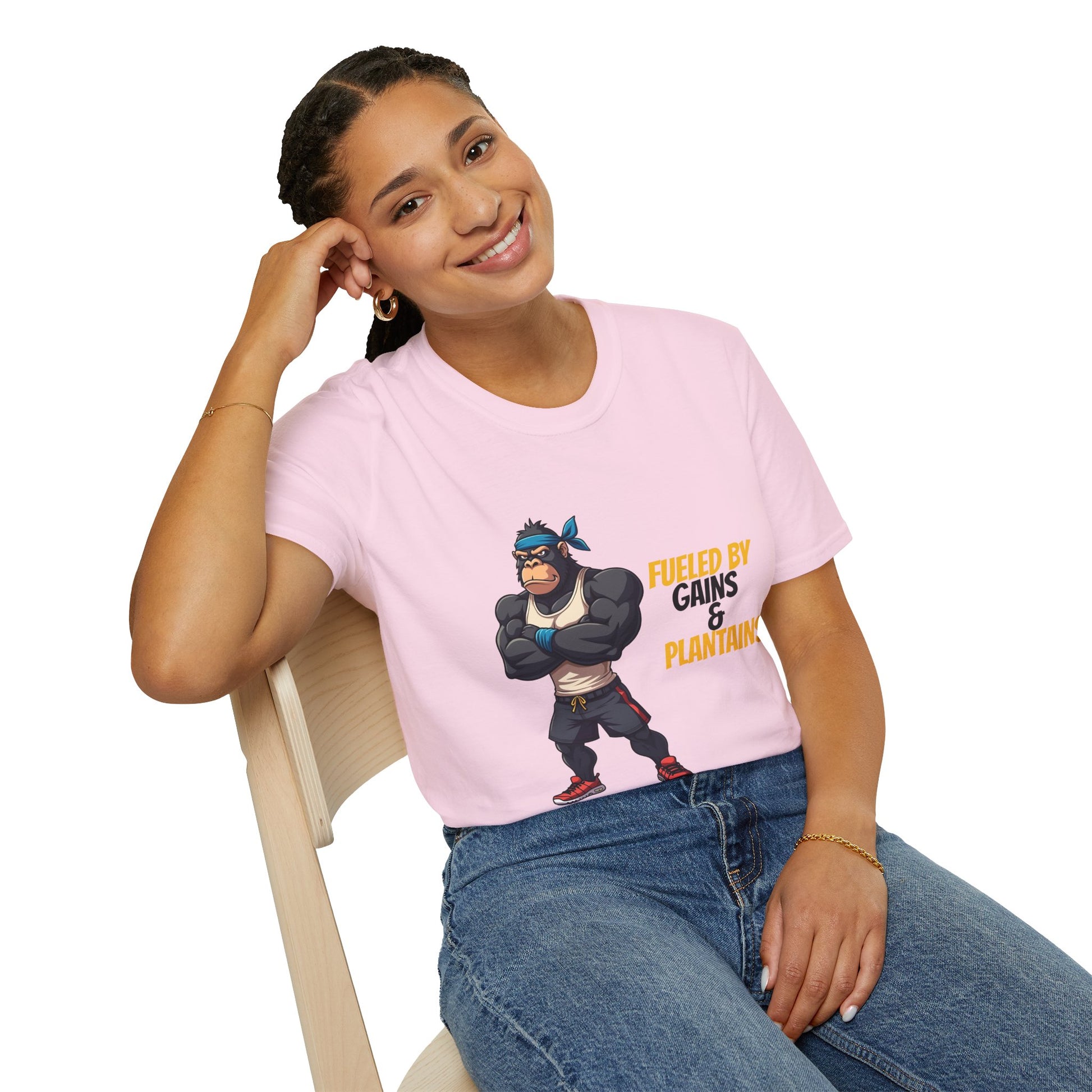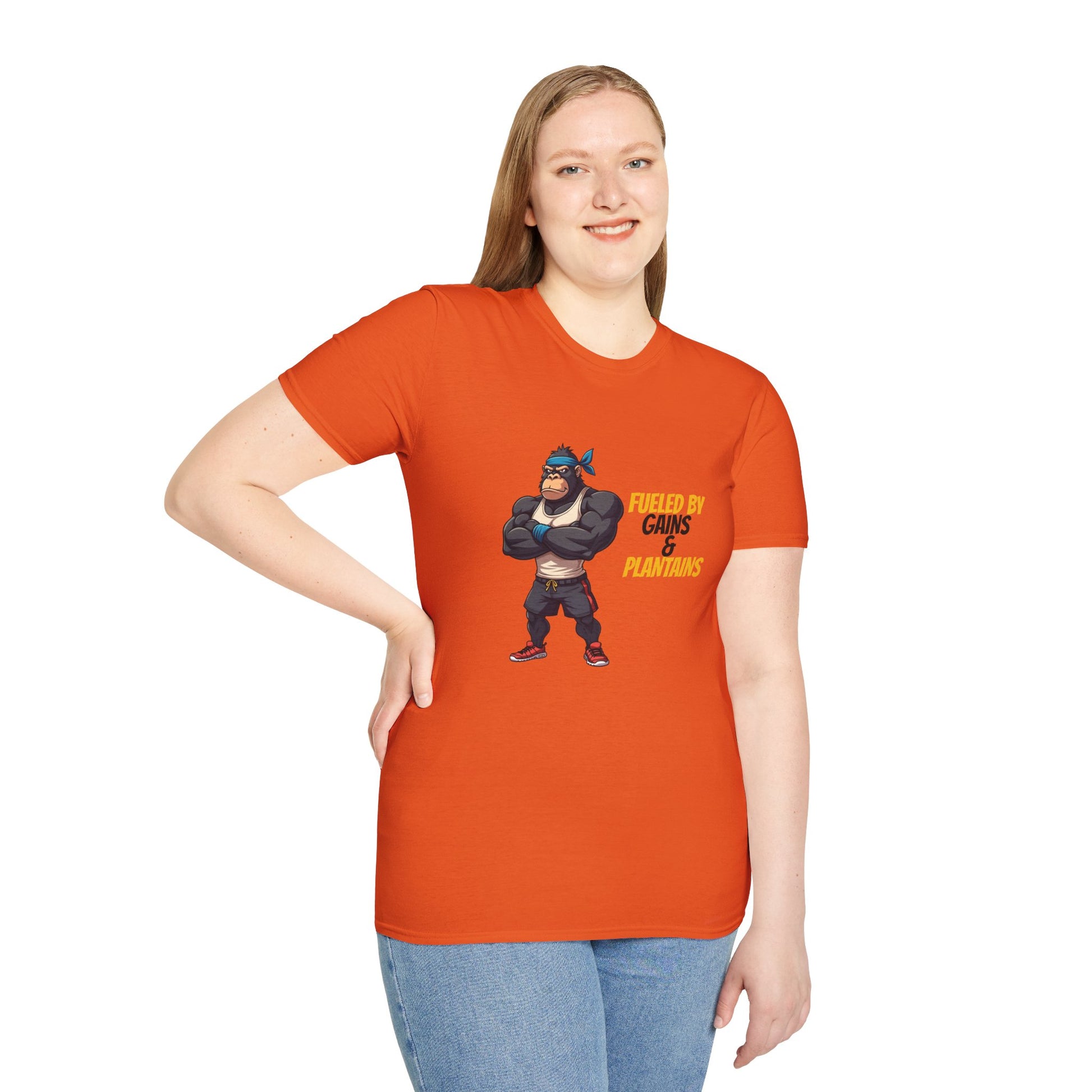 "Fueled by Gains & Plantains" Muscle Monkey Graphic Tee β Fun Fitness & Tropical Vibes T-Shirt with Muscular Primate Design