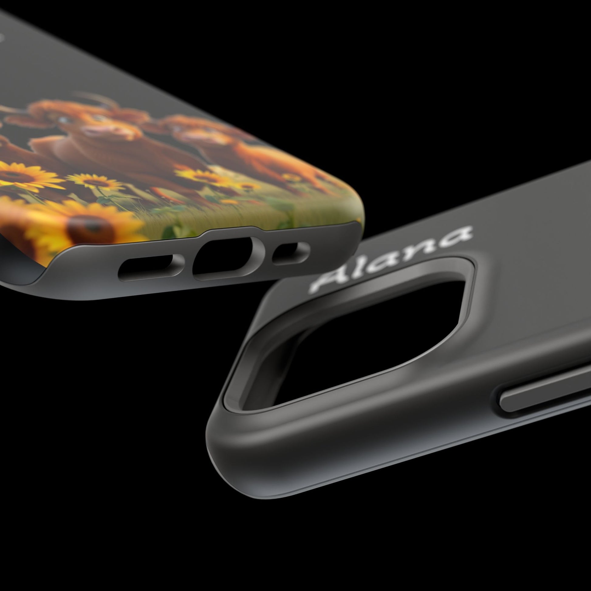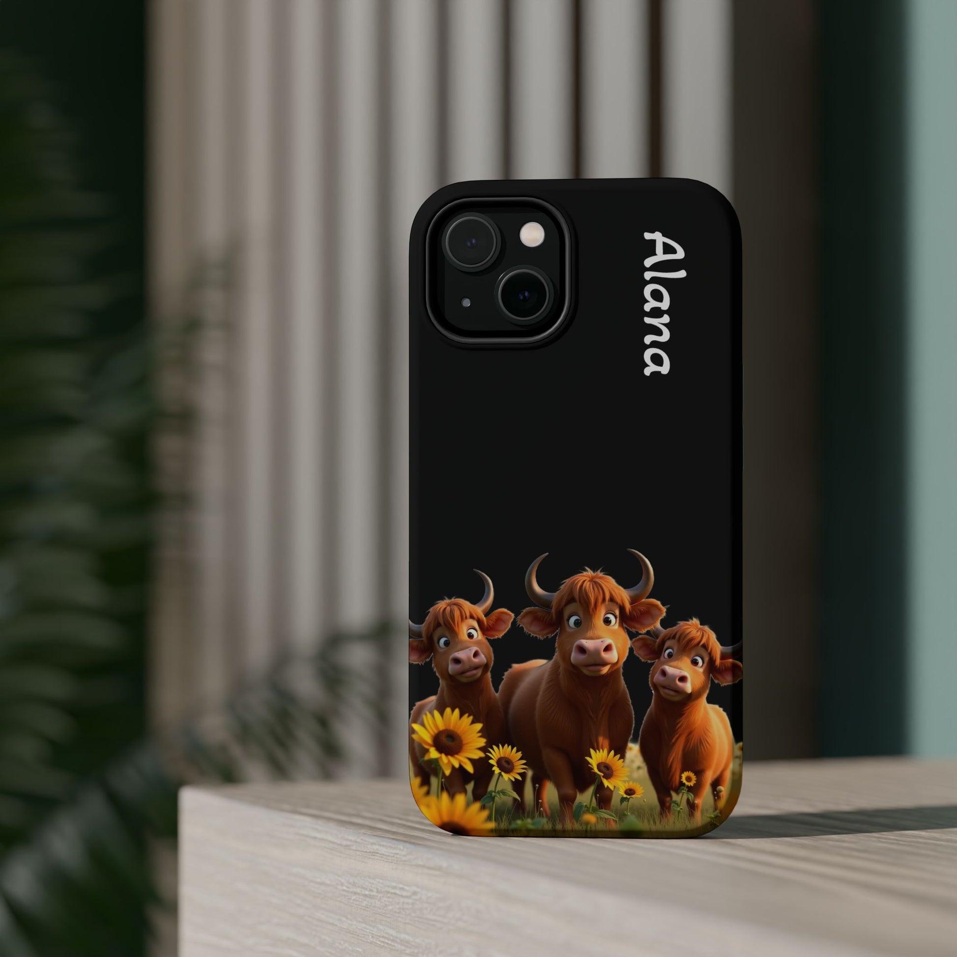 This delightful case showcases a fluffy Highland Cow family looking their cutest, with your chosen name beautifully displayed at the top. It’s udderly charming!
