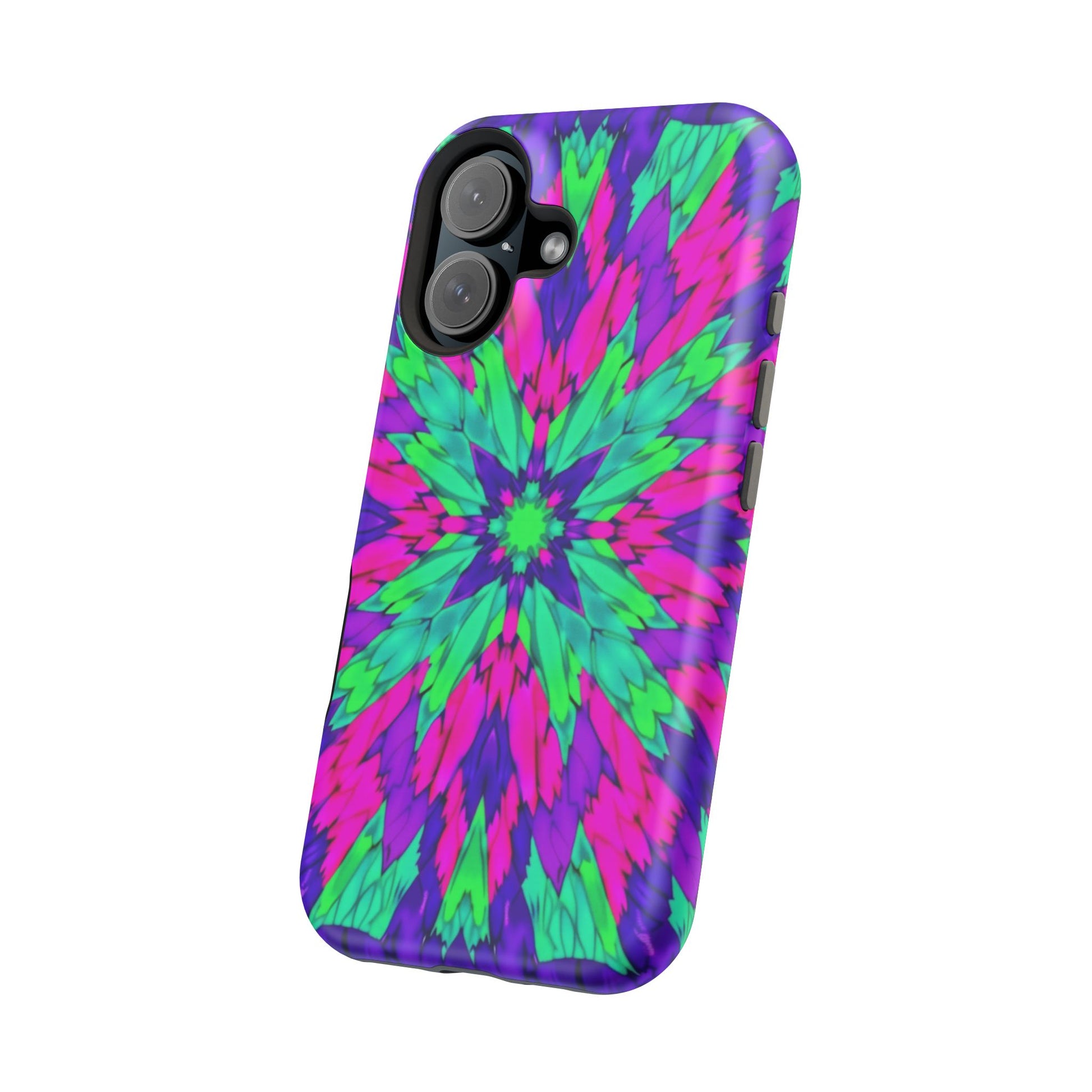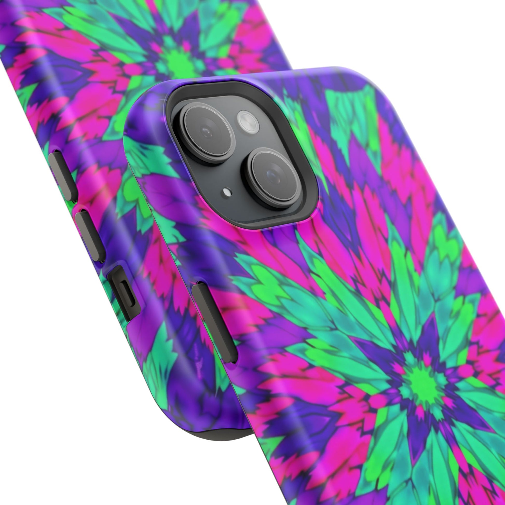 This striking case features a mesmerizing mandala bursting with neon pinks, electric blues, and vivid greens in a hypnotic symmetrical design. Itโs like a party for your eyes!