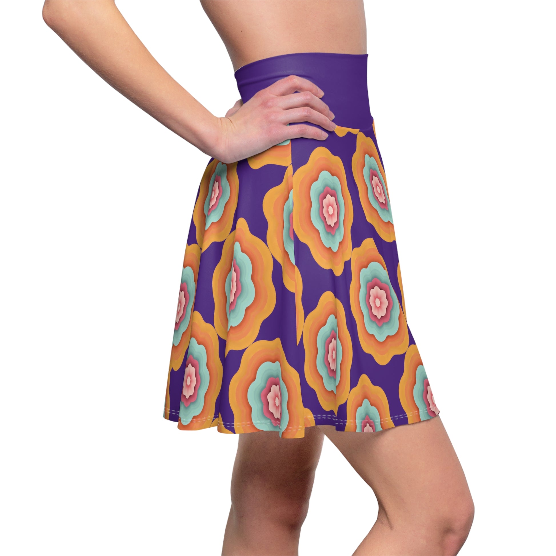 Brighten your wardrobe with the Vivid Blossom Skater Skirt, a captivating mix of bold royal purple and vibrant floral patterns. Perfect for expressing your unique style, this skirt combines comfort, movement, and an eye-catching design.
